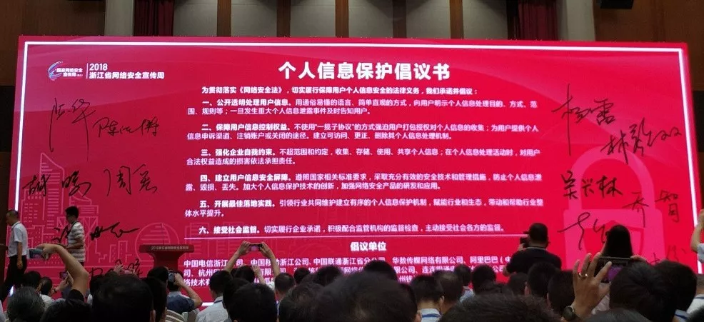 宣传周启动仪式开始,中国工程院院士陈纯、省委网信办副主任马晓军为浙江省网络空间安全协会揭牌。随后,省内12家大数据应用企业负责人共同签署了倡议书。