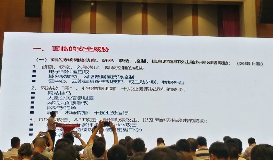 国家信息技术安全研究中心原副主任兼总工程师李京春进行了主题为《依法加强关键信息基础设施保护》的演讲。李主任通过实例表明了目前面临的安全威胁,包括网络侦查、窃密、渗透、控制、信息泄露等网络威胁;从多角度分析目前的挑战与机遇,表示应依法开展重点保护,包括网络设备设施安全、网络数据安全、网络信息安全等方面的保护;最后从三个方面提出了对策和建议,表明应学习落实习总书记新指示,实现网络强国战略目标,没有网络安全就没有国家安全,没有信息化就没有现代化。