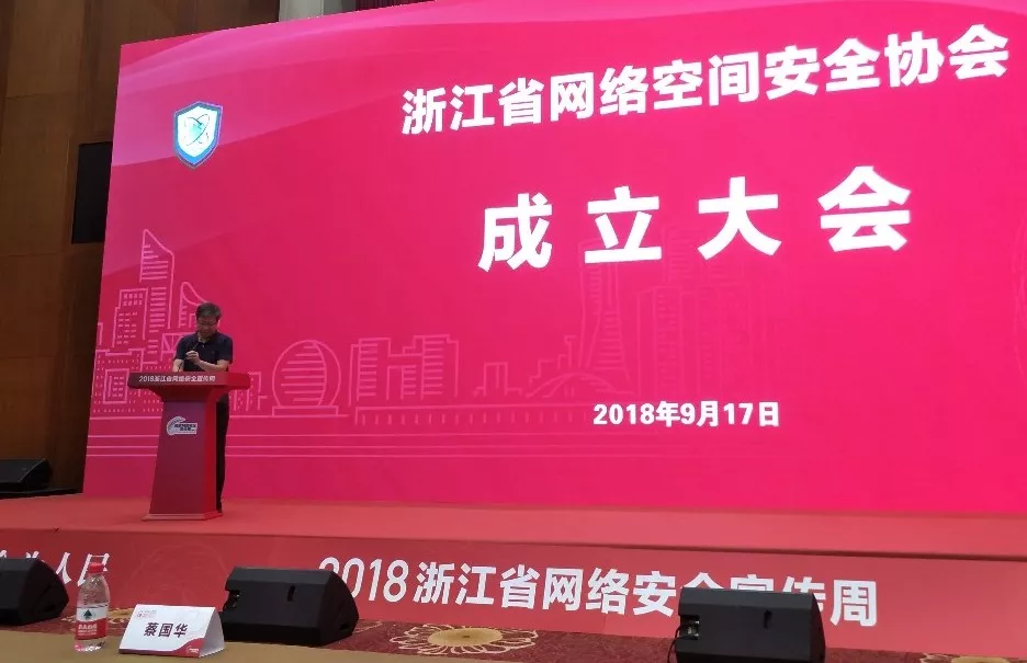 三位专家演讲结束后,浙江省网络空间安全协会成立大会正式开始。首先,由省民政厅社会组织管理局局长蔡国华宣读同意成立浙江省网络空间安全协会的批复,浙江省网络空间安全协会正式成立。