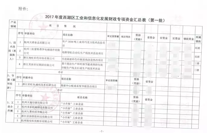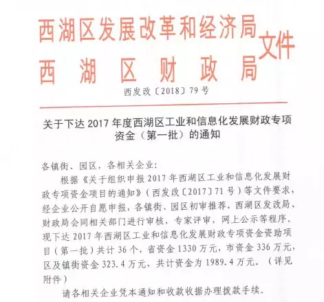 2018年12月6日,下达2017年西湖区工业和信息化发展财政专项资金资助项目(第一批)共计36个,共计资金为1989.4万元,华途股份荣幸成为其中一员。